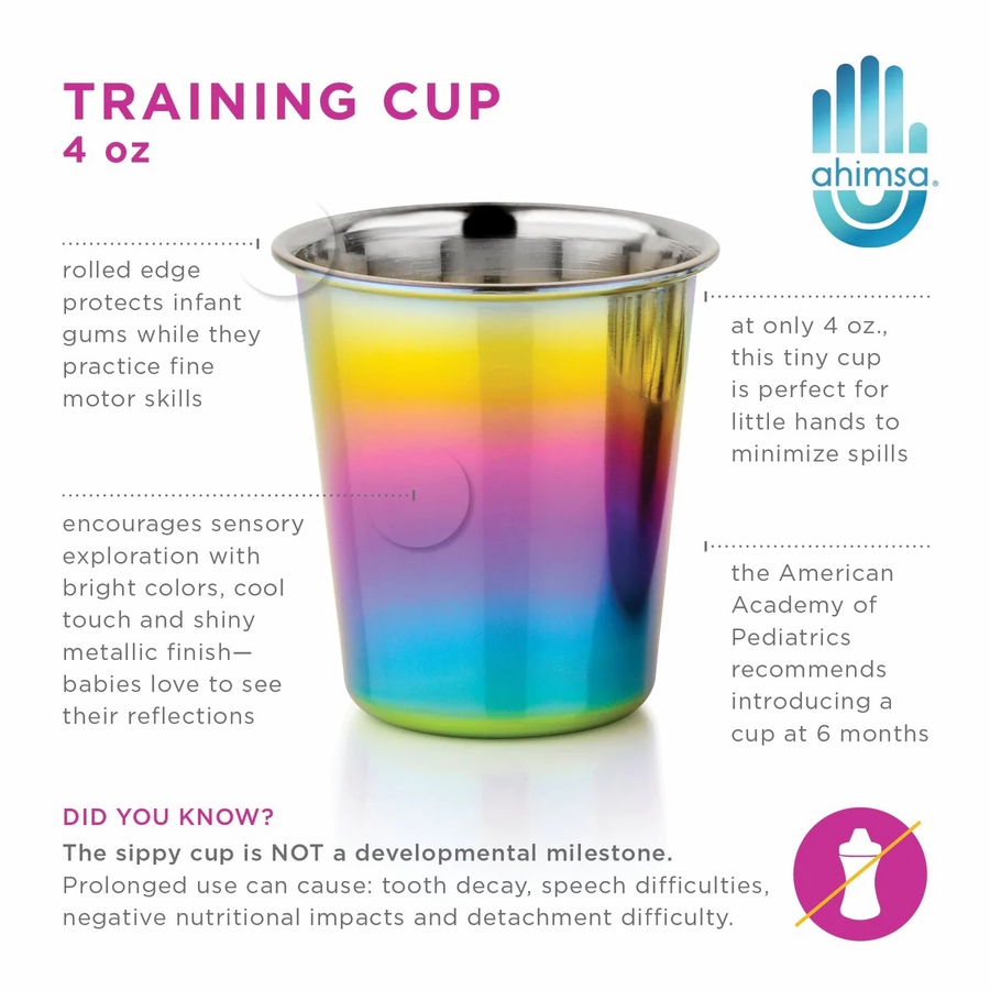 • The training cup with a rolled edge allows infants and toddlers to practice skills early without big spills or broken dishes. The American Academy of Pediatrics recommends introducing a cup at 6 months.