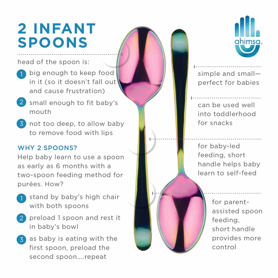 - The spoons are big enough to keep food on (so it doesn't fall out and cause frustration), but small enough to fit in baby's mouth. The short handle provides more control for both baby-led and parent-assisted feeding.