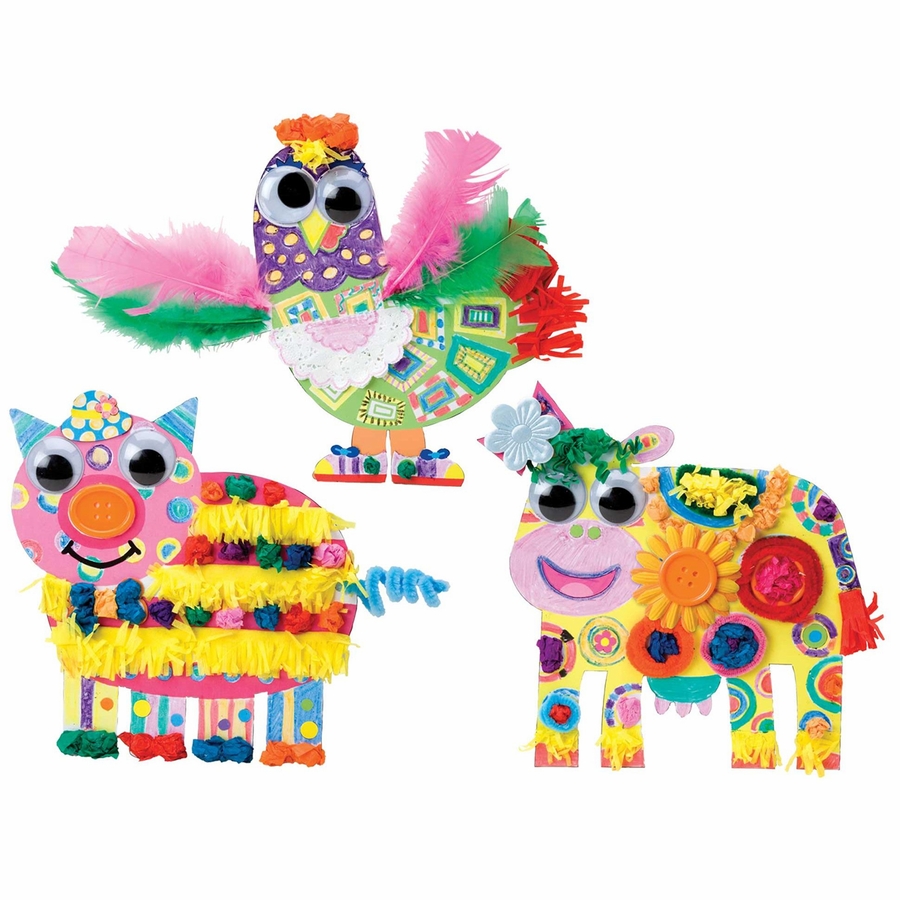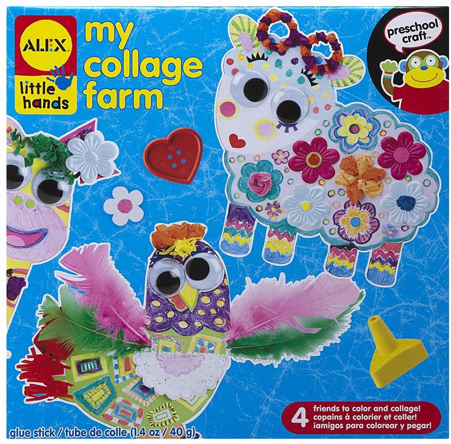 You sing the songs, you know the animals, now bring the farm to life with Collage a Farm. This kit contains everything you’ll need to color and decorate 4 farm friends with wacky designs and lots of cool supplies. Includes 4 printed animal cutouts, punch-outs, stickers, glue stick, wiggly eyes, crayons, ribbons, feathers and more! Ages 3+ years.