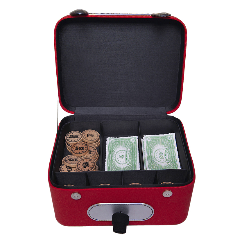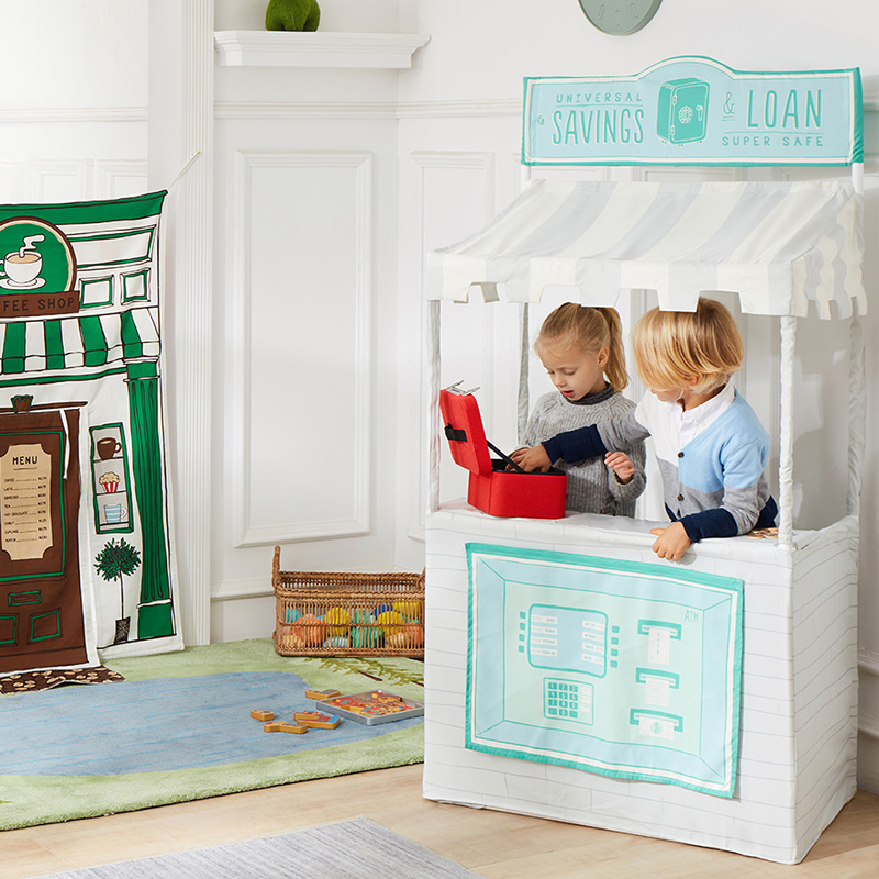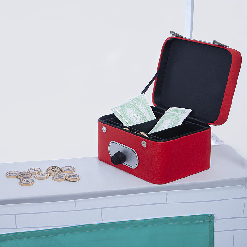 Your children will be in the money with our Cash Box and play money. Our Cash Box comes with 24 coated bills ranging in value from $1 to $100, and 22 wooden coins, in pennies, nickels, dimes, quarters and half dollars. All this pretend cash can be neatly sorted inside the removable cash tray, which nestles in the cotton canvas box, complete with pretend combination lock, faux metal fasteners, and a handle to easily carry away.