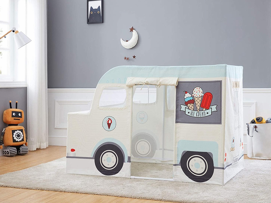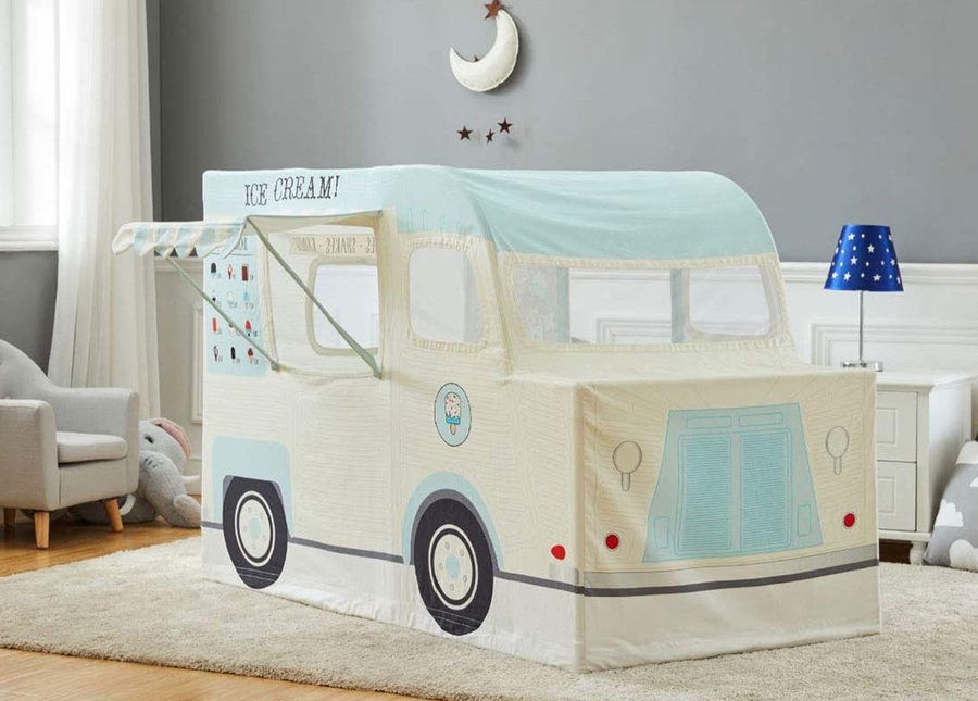 I scream! You scream! We all scream for ice cream! Our canvas printed Ice Cream Truck Playhome will provide hours of fun for kiddos. The graphics include whimsical images of tasty treats and a fun license plate and features a usable service window and mesh windows all around. Don’t forget the removable plush steering wheel for driving around the neighborhood! Cotton canvas and metal poles with plastic connectors. Add our Ice Cream Play Food for a complete imaginary play experience. Sweet! Adult assembly.