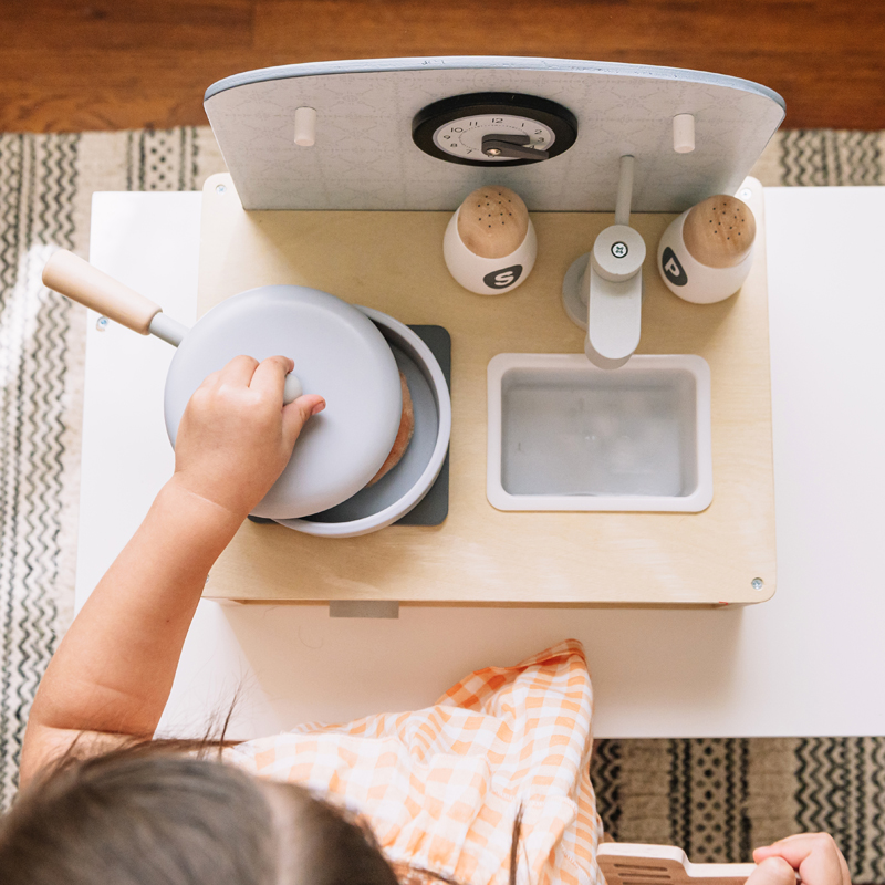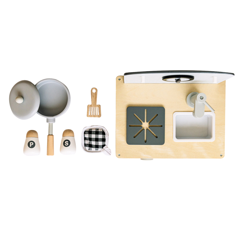 Let’s lay it all our on the table—with our Table it Kitchen. Our sweet little wooden kitchen comes complete with salt and pepper shakers, pot holder, spatula, and a pot with lid, The stove top knob makes a realistic clicking noise when turned, and the clock has working hands you you can make dinnertime anytime! And best of all, it all folds down into itself for easy transport. Never too many cooks in the kitchen!