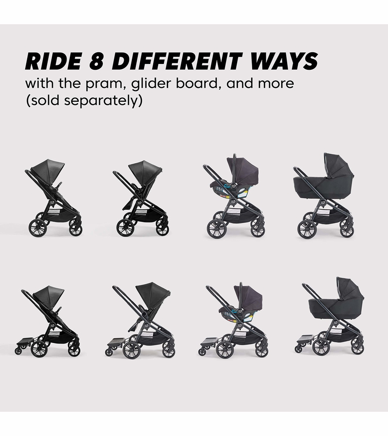 The infant car seat, pram, and glider board (sold separately) create 8 modes of use—perfect for going even bigger.