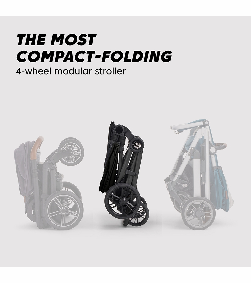 - Most compact (one hand) folding 4-wheel modular stroller on the market