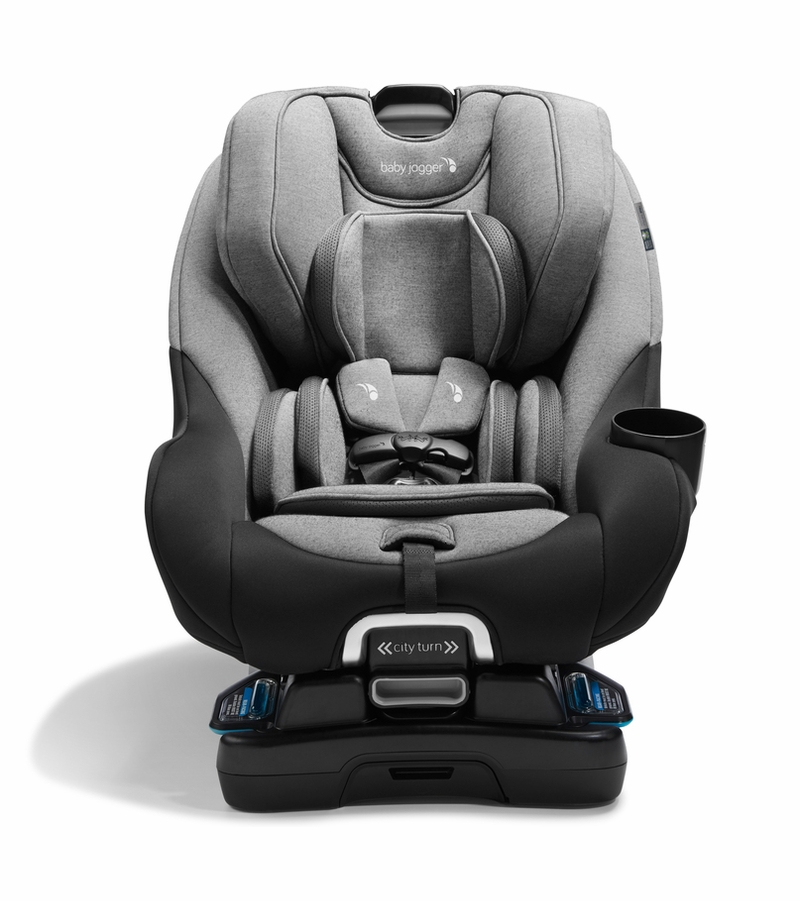 The Baby Jogger® City Turn™ Convertible Car Seat features a secure rotating mechanism that allows you to turn the seat 180 degrees with one hand while in rear-facing mode. The unique patented rotation brings your child 10 inches closer to you, and helps you maintain a more upright posture when lifting your child in and out and buckling them into the car seat. The seat smoothly rotates with one hand, then audibly clicks into place for assurance that it is safely secured. The car seat converts from rear-facing harness (4-50 lb) to forward-facing harness (22-65 lb) to grow with your child. Soft, lightweight fabrics featuring COOLMAX® moisture-wicking material will help keep your child cool and comfortable. Like your favorite workout wear, it's cooling and resistant to wrinkling and fading over time. The integrated RAPIDLOCK™ belt-tensioning technology and push-button LATCH make for a simple and secure installation in seconds. A 10-position headrest and 5-position recline ensure a comfy ride, and the no-rethread harness means you can adjust the harness without removing it. This seat has been tested with TRUE Test Plus™ safety standards, engineered to help protect your child in rollover, side, front, and rear collisions.