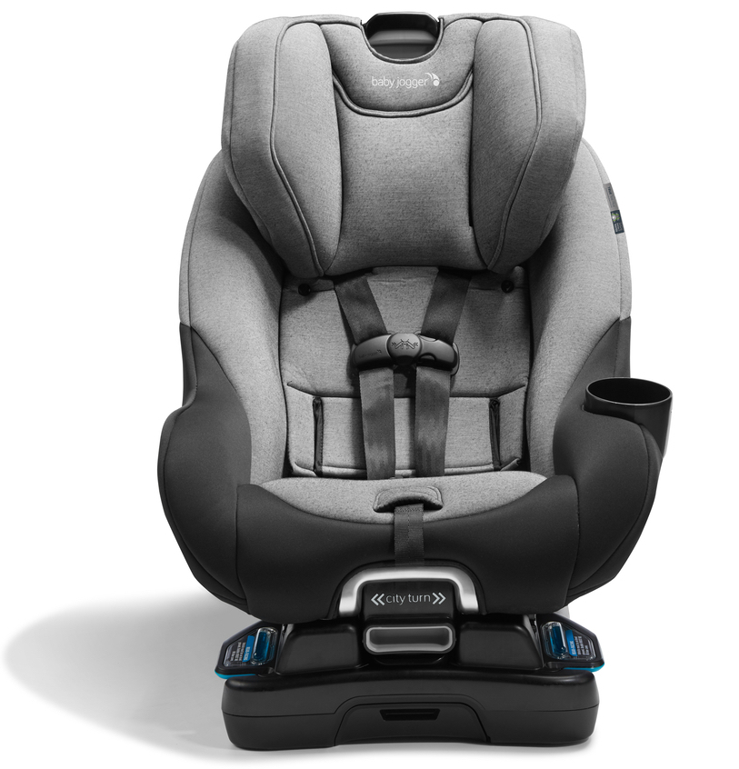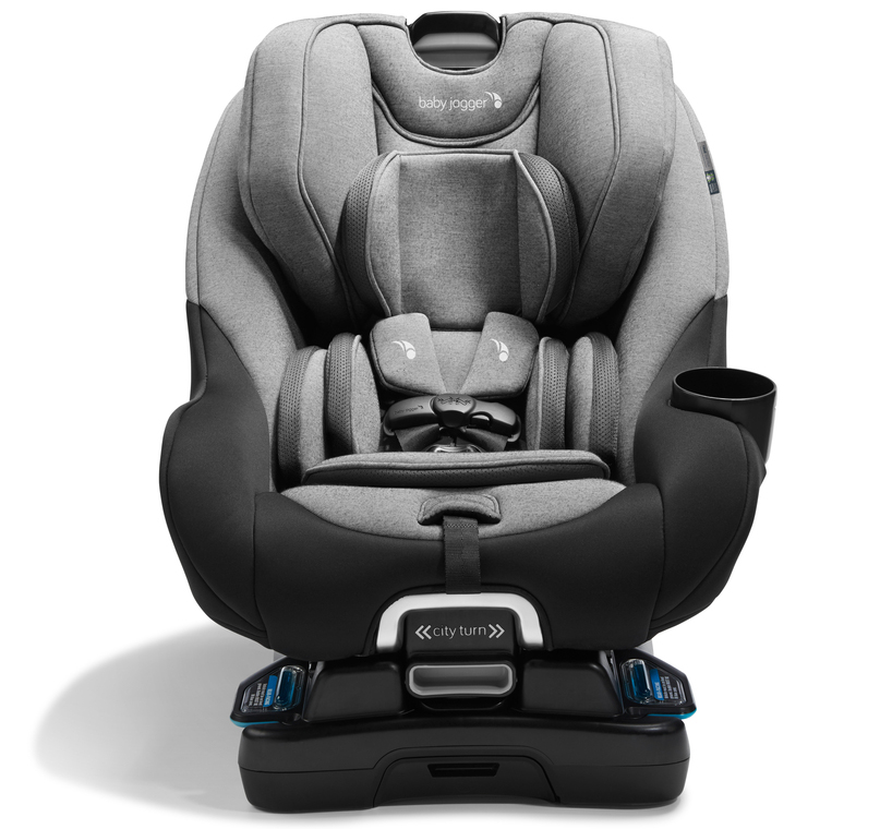 The Baby Jogger® City Turn™ Convertible Car Seat features a secure rotating mechanism that allows you to turn the seat 180 degrees with one hand while in rear-facing mode. The unique patented rotation brings your child 10 inches closer to you, and helps you maintain a more upright posture when lifting your child in and out and buckling them into the car seat. The seat smoothly rotates with one hand, then audibly clicks into place for assurance that it is safely secured. The car seat converts from rear-facing harness (4-50 lb) to forward-facing harness (22-65 lb) to grow with your child. Soft, lightweight fabrics featuring COOLMAX® moisture-wicking material will help keep your child cool and comfortable. Like your favorite workout wear, it's cooling and resistant to wrinkling and fading over time. The integrated RAPIDLOCK™ belt-tensioning technology and push-button LATCH make for a simple and secure installation in seconds. A 10-position headrest and 5-position recline ensure a comfy ride, and the no-rethread harness means you can adjust the harness without removing it. This seat has been tested with TRUE Test Plus™ safety standards, engineered to help protect your child in rollover, side, front, and rear collisions.