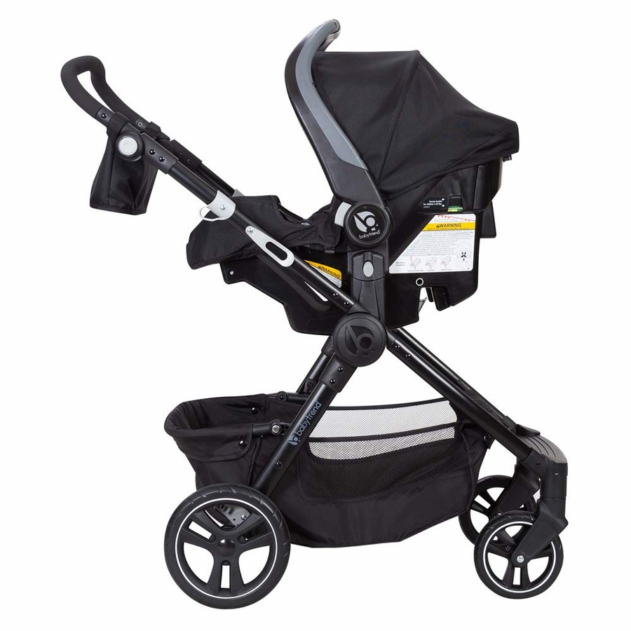 The Baby Trend® City Clicker Pro Snap Gear® Travel System is designed for easy maneuverability and flexibility. The adaptable stroller converts to an infant car seat carrier, reclined mode, or as a toddler stroller. The stroller features an adjustable handle and a large storage basket. The comfy seat has a 5-point safety harness, multi-position recline, and side windows and a sun visor.