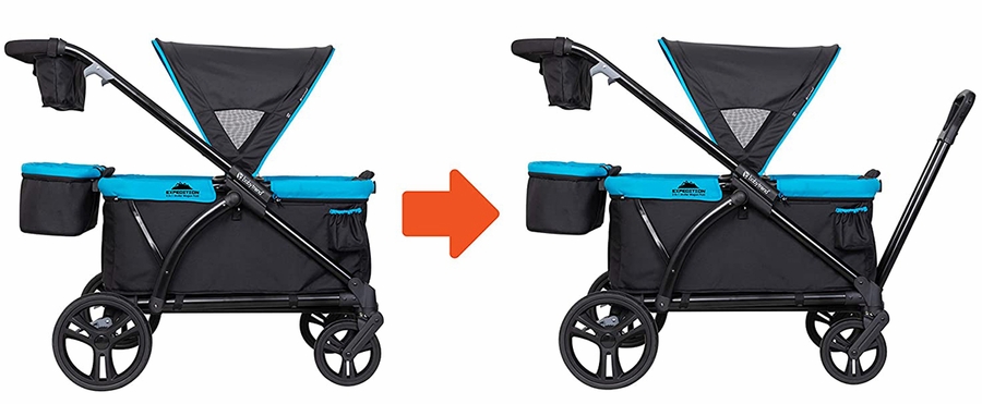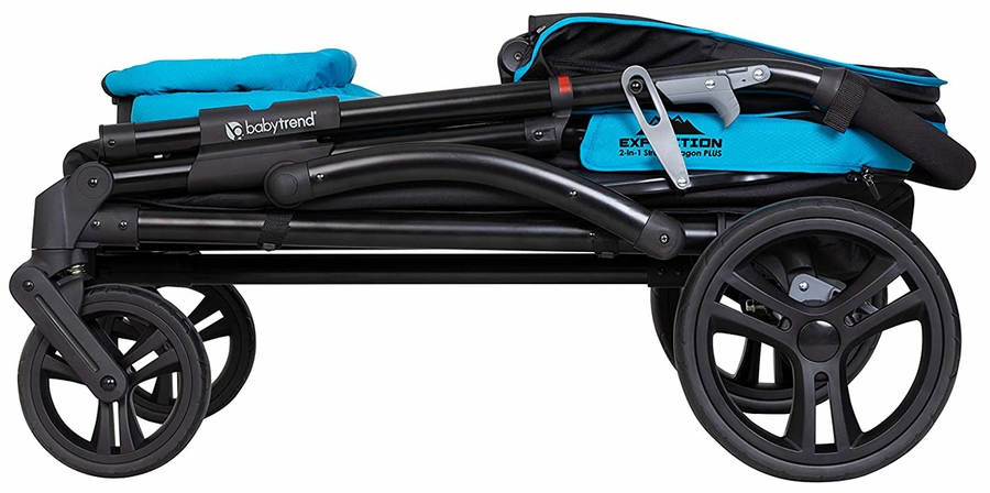 Get Ready for your outdoor adventure with the exclusive Baby Trend® Expedition 2-in-1 Stroller Wagon Plus! Designed with utility, safety and style, the Expedition 2-in-1 Stroller Wagon Plus is for the family that loves outdoor activities and discovery. The super large cargo space with built-in seating and the two 3-point safety harness belt allows kids to explore with safety. Little ones will enjoy the extra support with the versatile Seat2Mat. Plus, the extra-large ratcheting canopy with UPF 50+ protection and air-flow mosquito netting keeps your little ones away from the harmful sun rays and rain. Parents will also love the Ultimate Storage Solutions, which include parent and child trays with 2 cup holders and center consoles, plus 2 additional cup holders outside of the wagon. A flip over basket can easily be attached to the front or rear of the wagon, adding even more storage capabilities. The Baby Trend® Expedition 2-in-1 Stroller Wagon Plus is equipped with easy one button removable 11" rear wheels and durable 8" front wheels for easy maneuverability. With the Hideaway Pull Handle, parents can easily transform the “Push” stroller into “Pull” wagon mode. The telescoping slim fold and the quick-release wheels allow the wagon to be easily stored and transported.