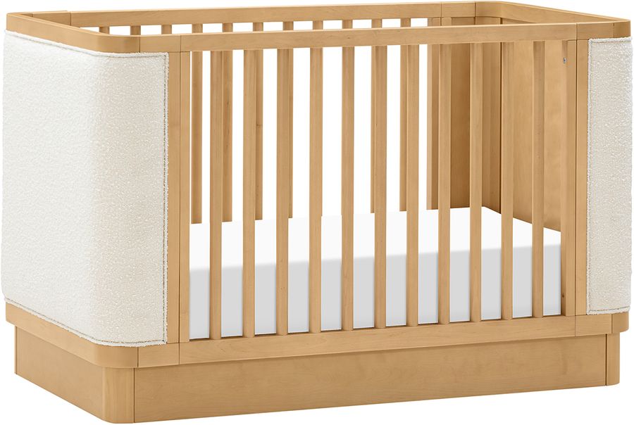 The Bondi Boucle 4-in-1 Convertible Crib celebrates boho-inspired design with its warm wood tone, rounded corners, and cozy boucle upholstery to create a dreamy aesthetic for your nursery . The Bondi is designed to grow with your babe using an included toddler bed conversion rail and is screened for harmful chemical emissions to ensure it meets GREENGUARD GOLD Certification.