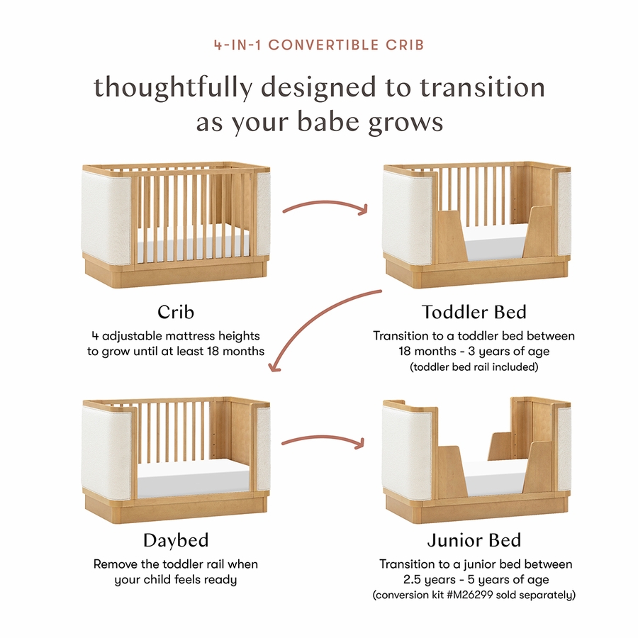 - 4-IN-1 CONVERTIBILITY: Easily transitions as your babe grows from crib to toddler bed, daybed, and junior bed with an included toddler bed conversion kit for your convenience. Junior bed conversion kit M26299 sold separately. Suitable from newborn up to 5 years old.