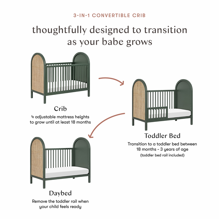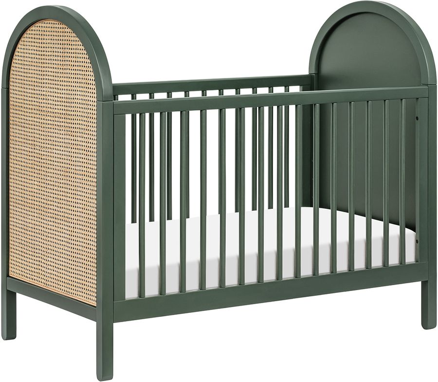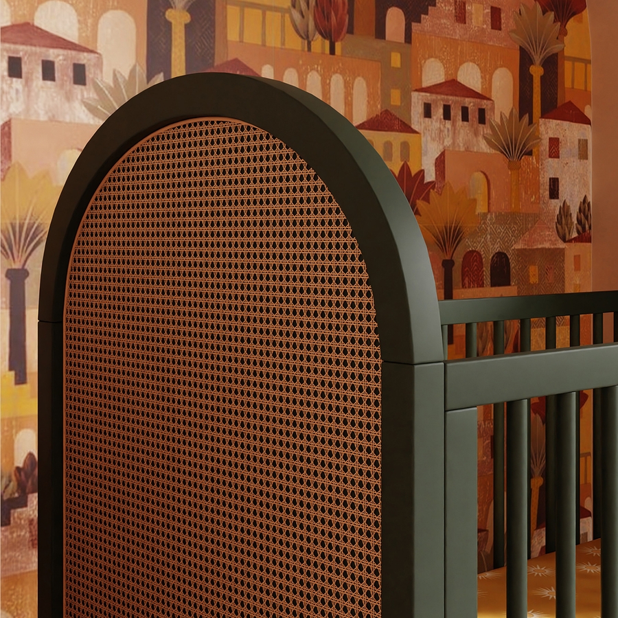 The Bondi Cane 3-in-1 Convertible Crib celebrates boho-inspired design and natural materials with its playfully arched side panels, curved feet, and woven plant-based cane. The Bondi is designed to grow with your babe using an included toddler bed conversion rail and is screened for harmful chemical emissions to ensure it meets GREENGUARD GOLD Certification.