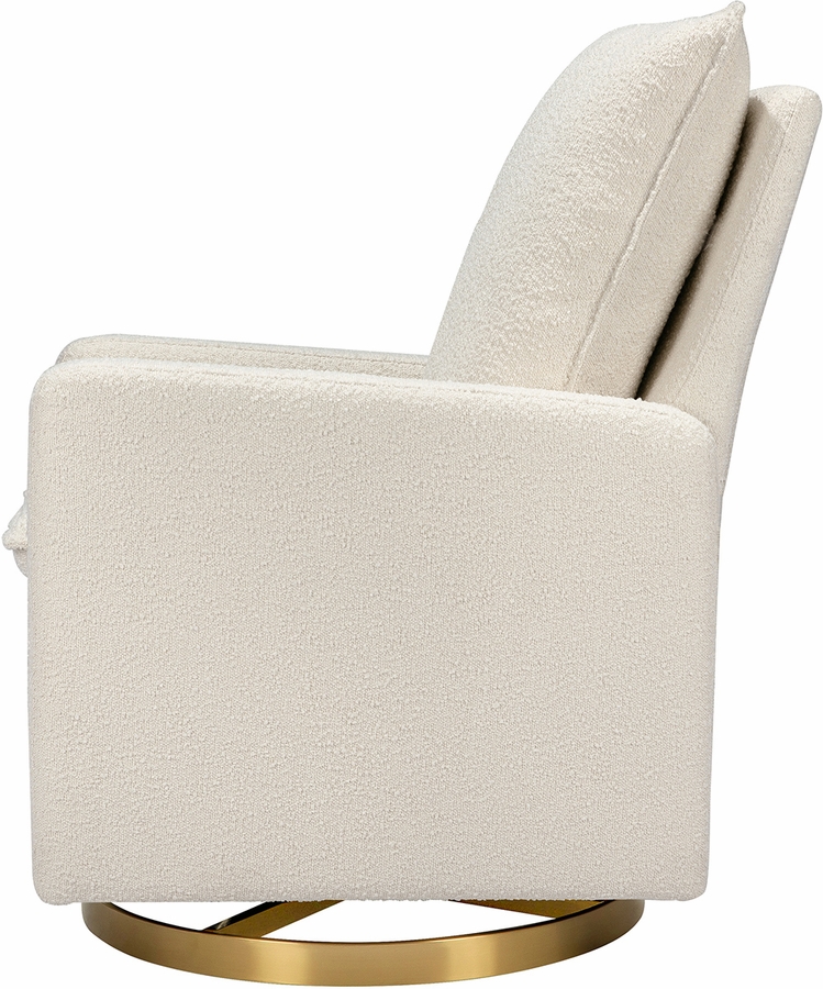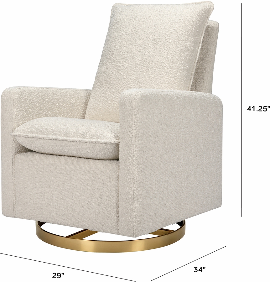 The Cali Pillowback Swivel Glider has been designed for mamas and papas with a high plush pillowback for head and neck support. The smooth gliding, 360-degree swivel base allows you to gently lull your babe to sleep. It's a stylish and comfortable choice for the modern nursery that's upholstered by hand in texture-rich boucle fabric to contrast the gold-tone plated iron metal base for a subtle touch of luxury.