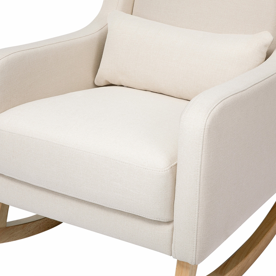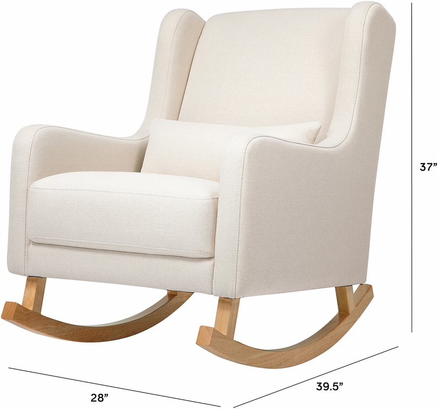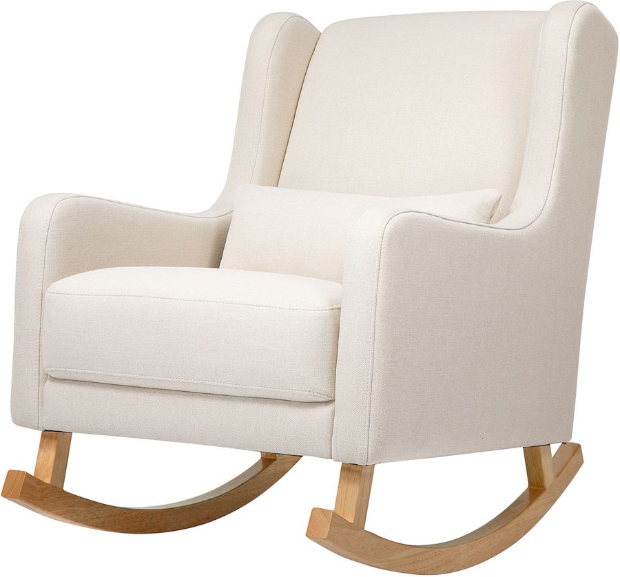Take a moment to relax in the charming mid-century styled Kai rocking chair. Designed with modern rounded edges, curved rubberwood legs, and included lumbar cushion for added comfort. It's a stylish but also more sustainable choice for the modern nursery. Upholstered by hand in our eco-performance fabric, that is stain resistant, water repellent, and made with at least 30% recycled fibers.