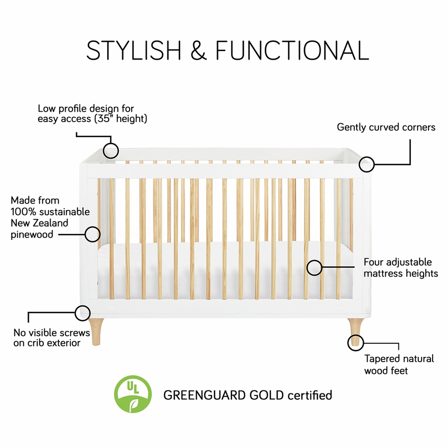 The popular Lolly 3-in-1 Convertible Crib highlights the natural beauty of our solid New Zealand pine wood with contrast styling and playful accents such as gently curved corners and tapered natural feet. Modern and functional, an included toddler bed conversion kit allows you to seamlessly convert from crib to toddler bed to daybed as your babe grows. GREENGUARD Gold certified to ensure healthy indoor air quality, the Lolly is the go-to choice for parents who appreciate style and safety.