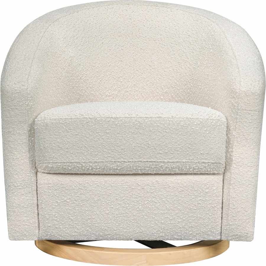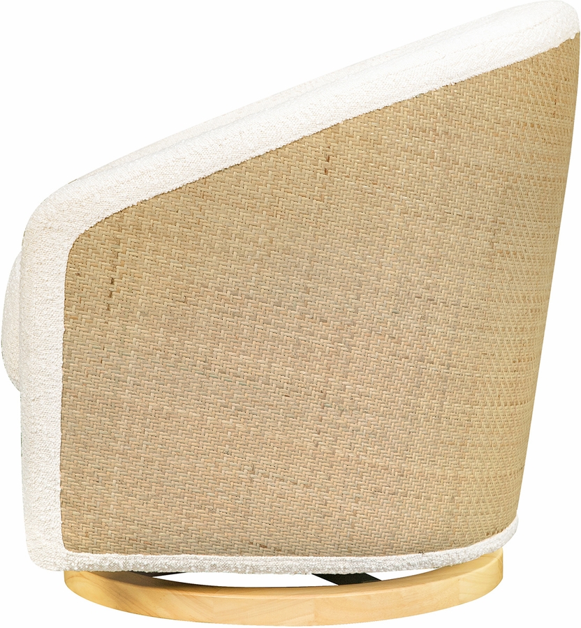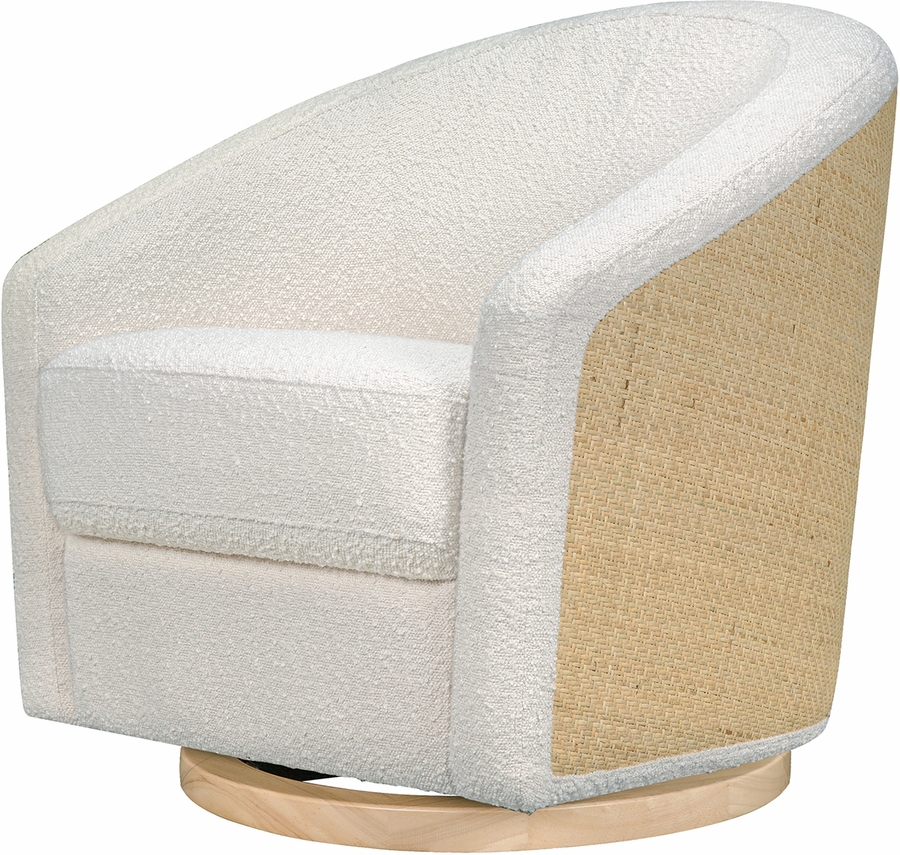Snuggle in and rock babe to sleep with the sublime comfort of the Madison Swivel Glider in boucle on a light wood base. The softly rounded back, hugged by natural woven cane, and spacious seat make for heavenly cuddling while the metal swivel mechanism allows you to turn and glide a full 360°. Upholstered by hand in beautifully textured boucle fabric to bring a cozy feel during the nursery years and beyond.