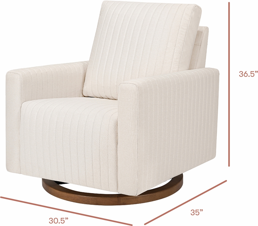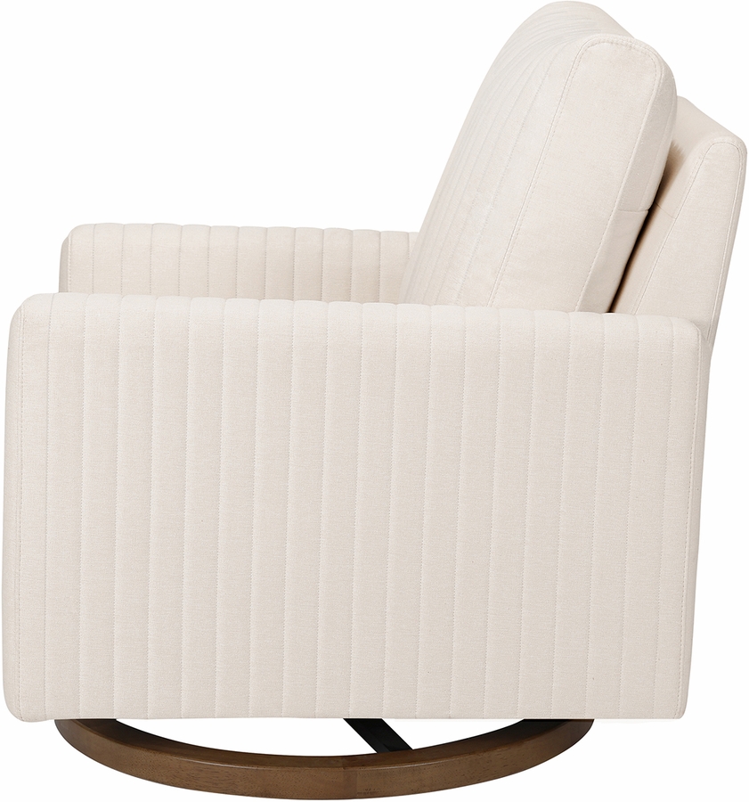 Meet the Poe Channeled Swivel Glider - a perfect blend of comfort, support, and mid-century modern sophistication. Its signature channel tufting invites you to sink into a plush seat while effortlessly rocking your babe to sleep with its smooth swivel and gliding functionality. It's a stylish but also more sustainable choice for the modern nursery. Upholstered by hand in our eco-performance fabric, that is stain resistant, water repellent, and made with at least 30% recycled materials.