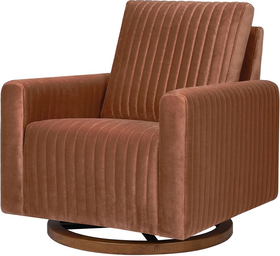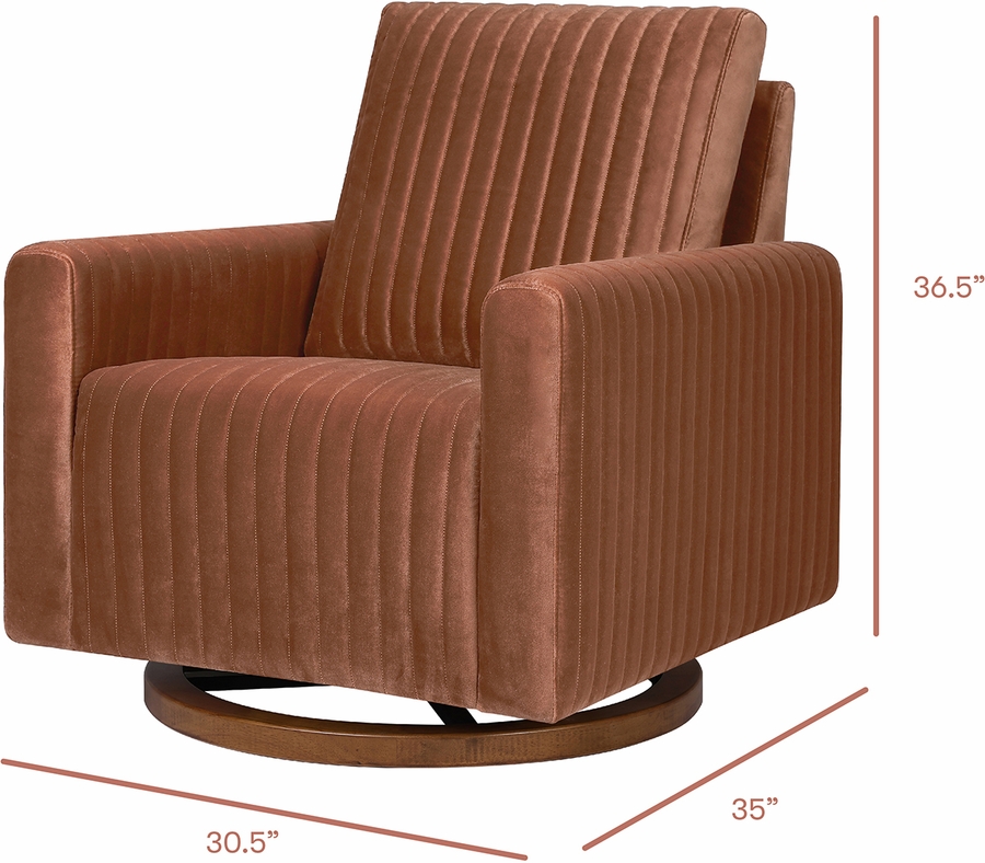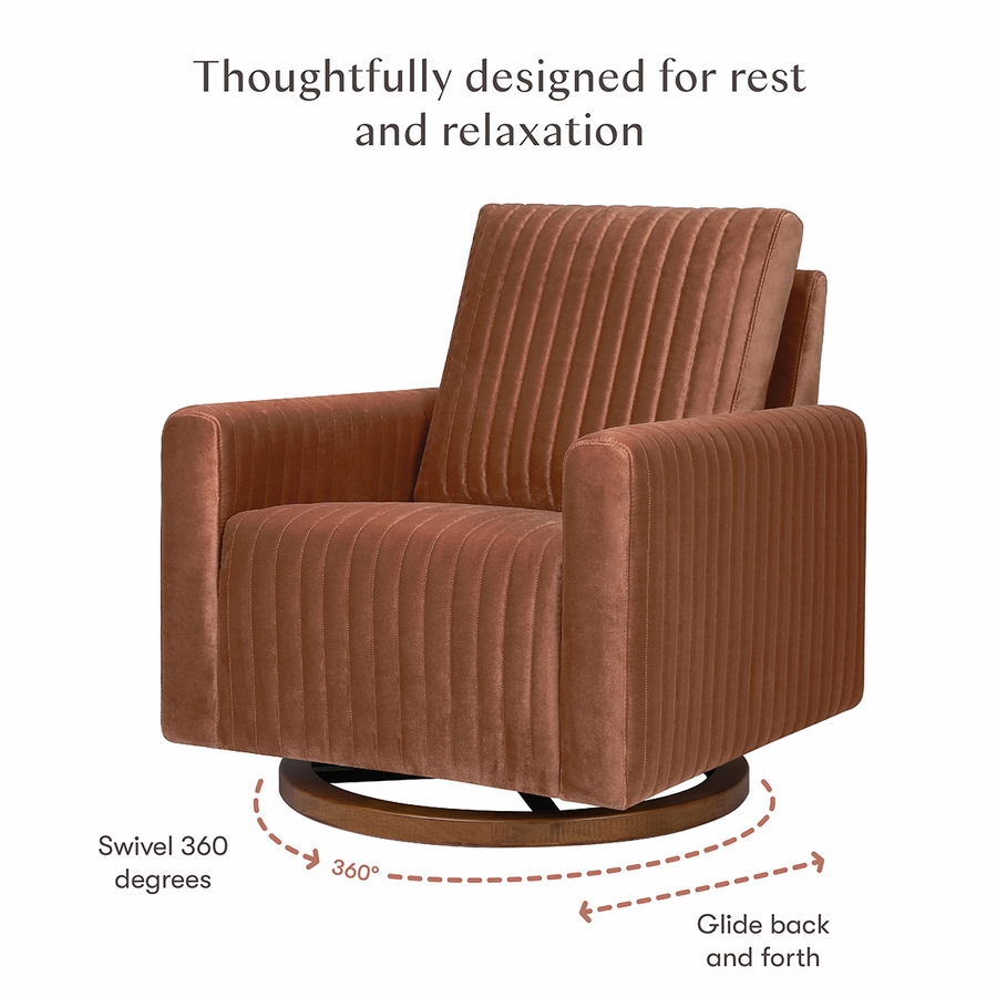 Meet the Poe Channeled Swivel Glider - a perfect blend of comfort, support, and mid-century modern sophistication. Its signature channel tufting invites you to sink into a plush seat while effortlessly rocking your babe to sleep with its smooth swivel and gliding functionality. Upholstered by hand in luxuriously soft velvet, the Poe Channeled Swivel Glider will add stylish comfort during the nursery years and beyond.