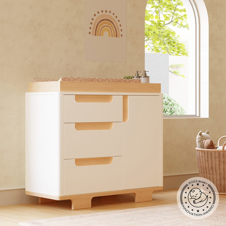 VERSATILE MODERN DESIGN: A sleek geometric form and rounded corners make Yuzu a stylish statement piece for the modern nursery. Designed with curved hand grooves, playful arched feet and includes a removable changing tray for the early years.