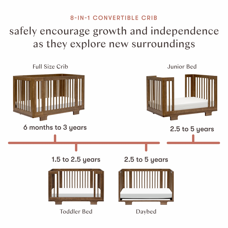 • All-stages 8-in-1 convertibility with 8 different configurations: bassinet, midi crib, midi toddler bed, midi daybed, full-size crib, full toddler bed, full daybed, and junior bed