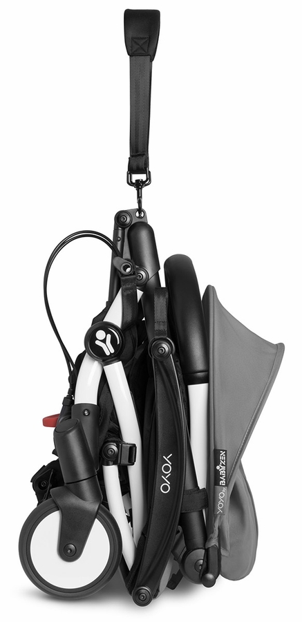 YOYO connect can be folded and hooked to the back of your YOYO² stroller using two hooks on the frame and a fixation strap to secure the transport mechanism. This makes it easy to switch from a double to a single stroller, and vice versa.