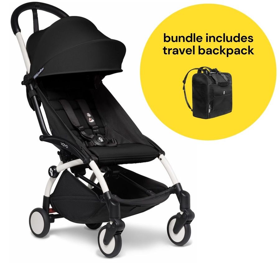 Babyzen YOYO2 Ultra Compact 6+ Stroller + Travel Backpack Bundle - White / Black