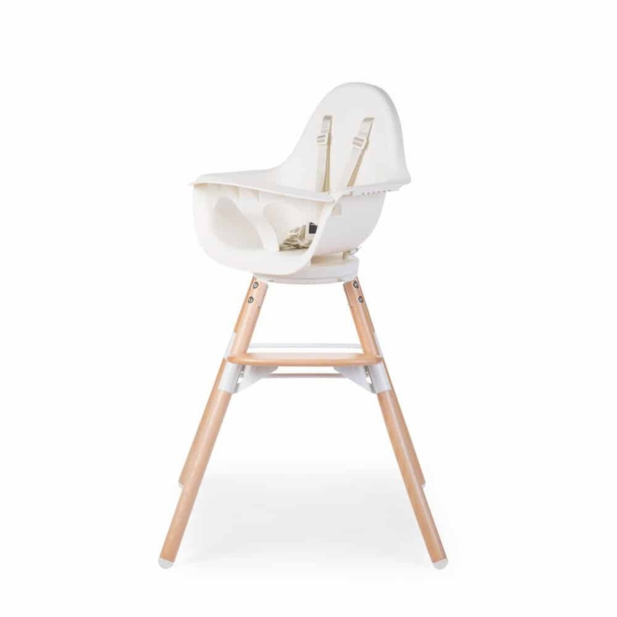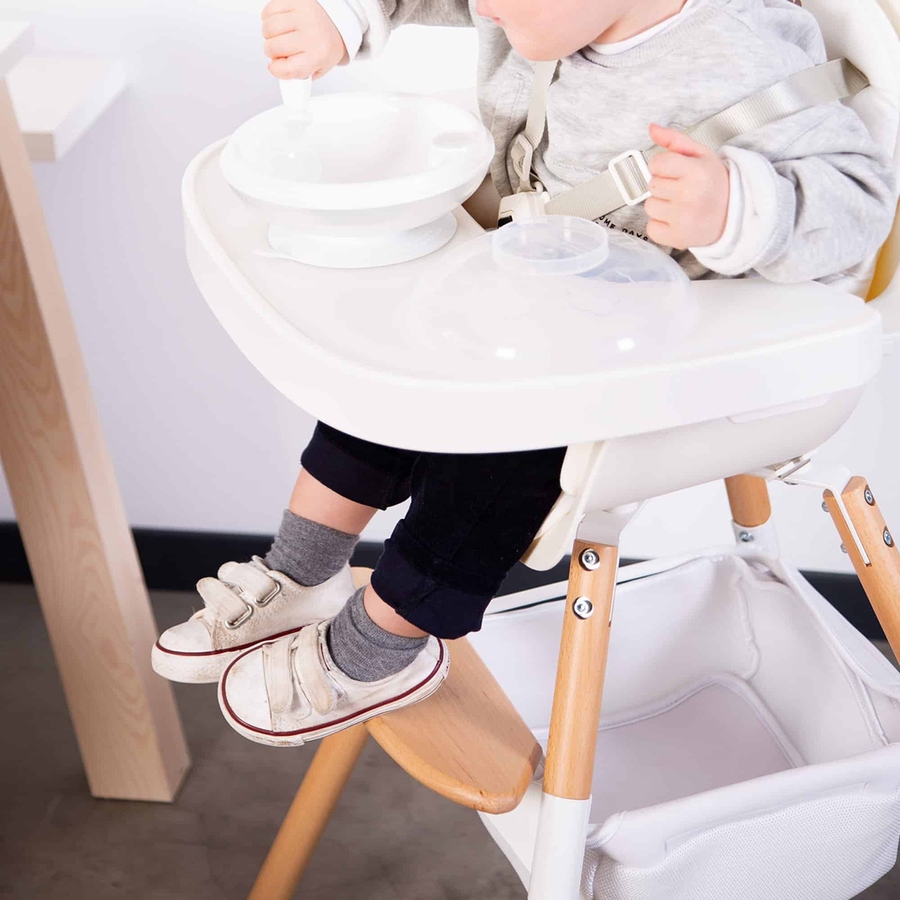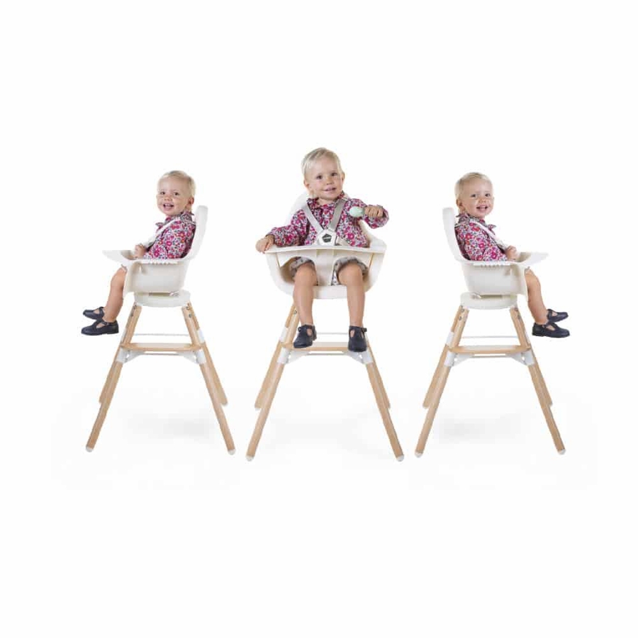 The award-winning Childhome Evolu One.80° High Chair was created to evolve with your growing child, and can be used from 6 months to 6 years. Once your baby outgrows the high chair phase and starts learning to eat on their own, it can be converted to a toddler chair that pulls up to a children’s table. The highchair features a unique 180° swivel seat, which allows parents to rotate baby to meet them comfortably during feedings. Designed to grow with your child, the highchair adjusts to 2 heights, a standard dining table (30 in) and a kid’s table (20 in). Available as an add on, a set of extra long legs give you the option to adjust the highchair to the height of a kitchen island (35 in), giving parents the extra flexibility to feed baby at any surface in their home. Unlike some highchairs, this tray slides to remove instead of tilting to keep food from sliding onto the floor. A safety bar and 5- point harness ensure your little one is secure. Both are removable as your baby grows older and the chair turns to a toddler chair.
