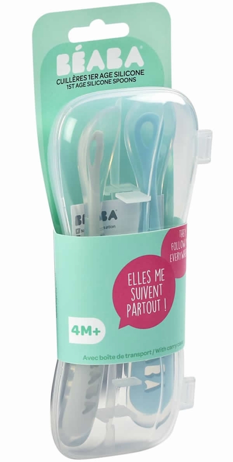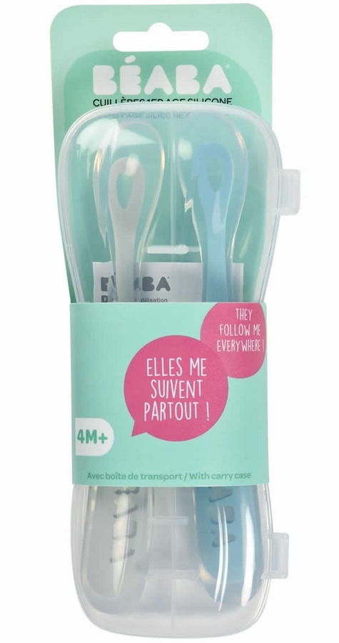 This BEABA Set of 2 Spoon Travel Set Cloud/Rain is designed for babies being introduced to solids. The handle is designed for adult hands easily to be able to feed baby. Made of ultra-supple silicone to be kind to baby’s gums. Set includes 2 spoons and a storage/transport case for protection and hygiene when traveling. Dishwasher safe.
