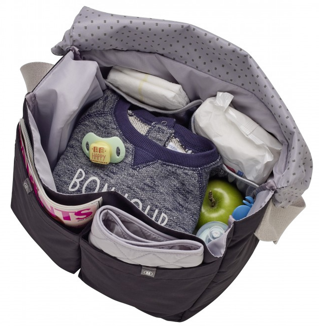 - Insulated storage pouch, pacifier case and removable changing pad included