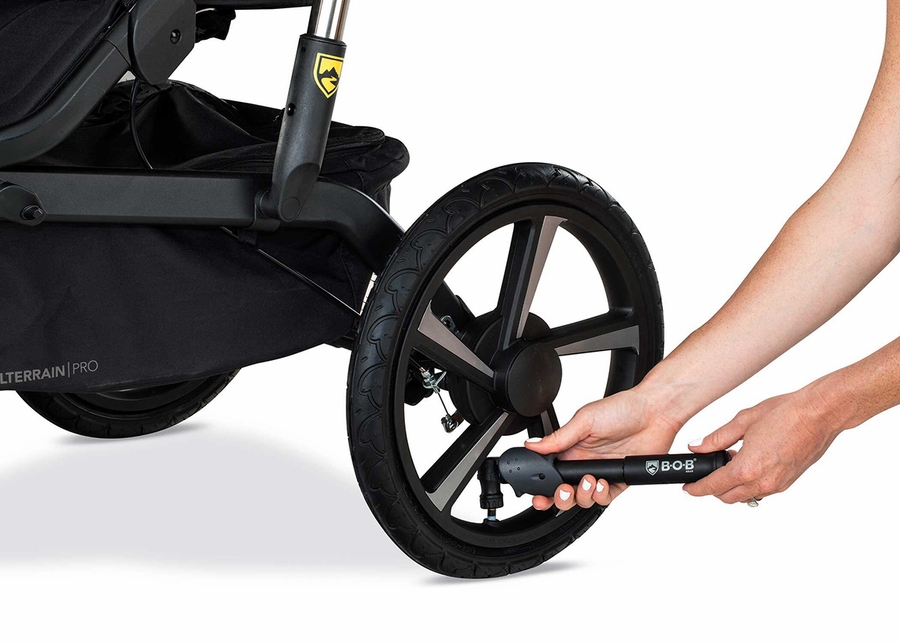Flexible pump hose ensures a secure valve fit even in tight or hard-to-reach places. Please refer to User Guide (Page 2) on the proper way to attach & pump the tires on your stroller prior to first use.