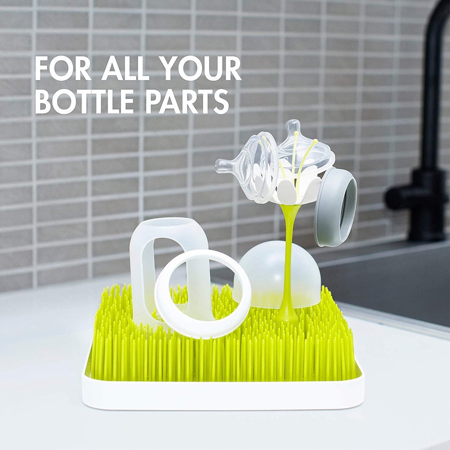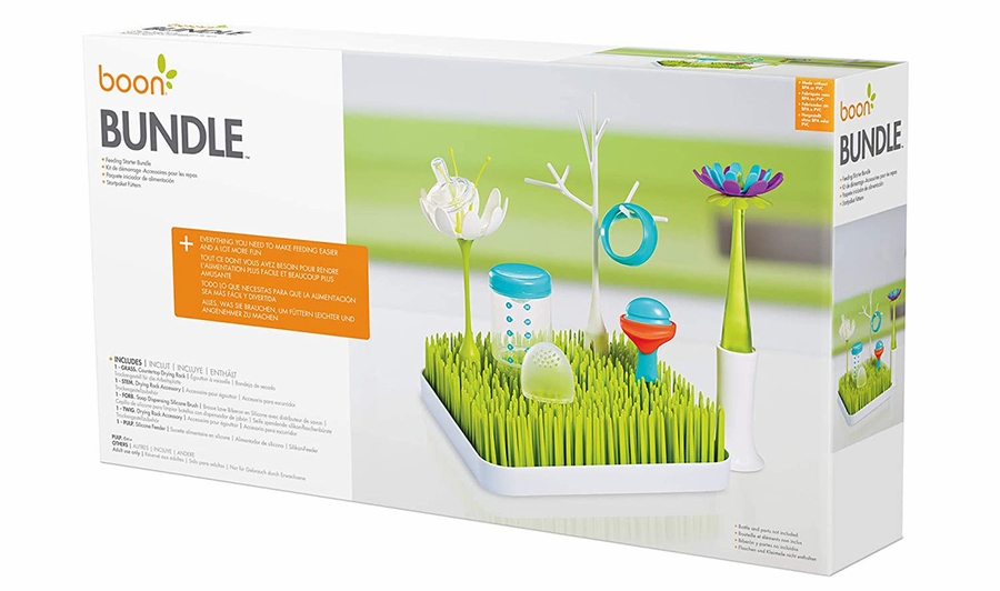 Everything you need to make feeding easier and a lot more fun. This feeding starter set includes GRASS, a cool countertop drying rack, effortlessly holds items upright, while STEM and TWIG accessories hold bottle and sippy cup parts that are easily lost. FORB, a soap dispensing silicone bottle brush assists in bottle and nipple cleaning. PULP, a silicone teething feeder allowing for easy feeding with its interior firm stem that forces food out where babies can get to it. Made without BPA and PVC.