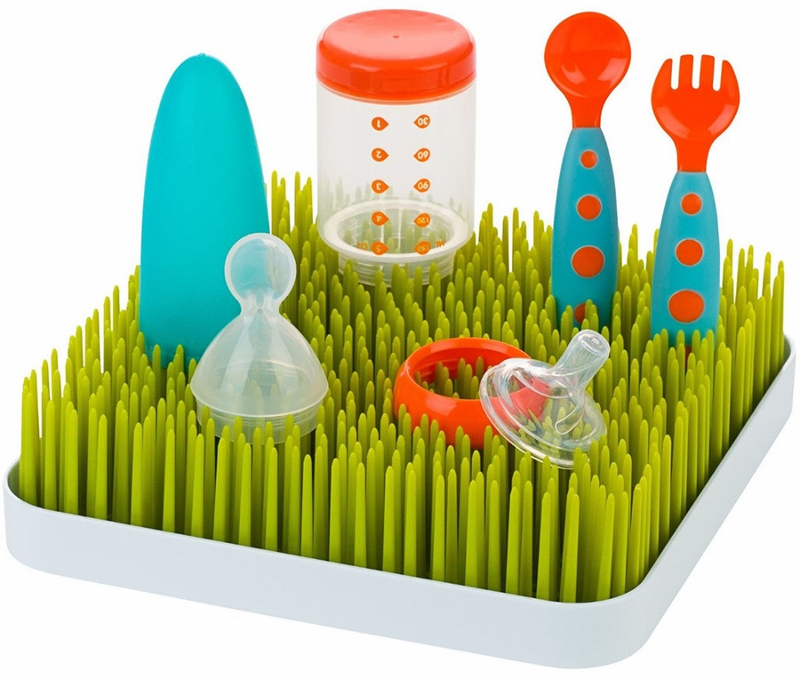 Time and space saver! Get bottles and nipples out of dishwasher and let them dry on the grass. We use the extra flowers and butterflies to hold the nipples.