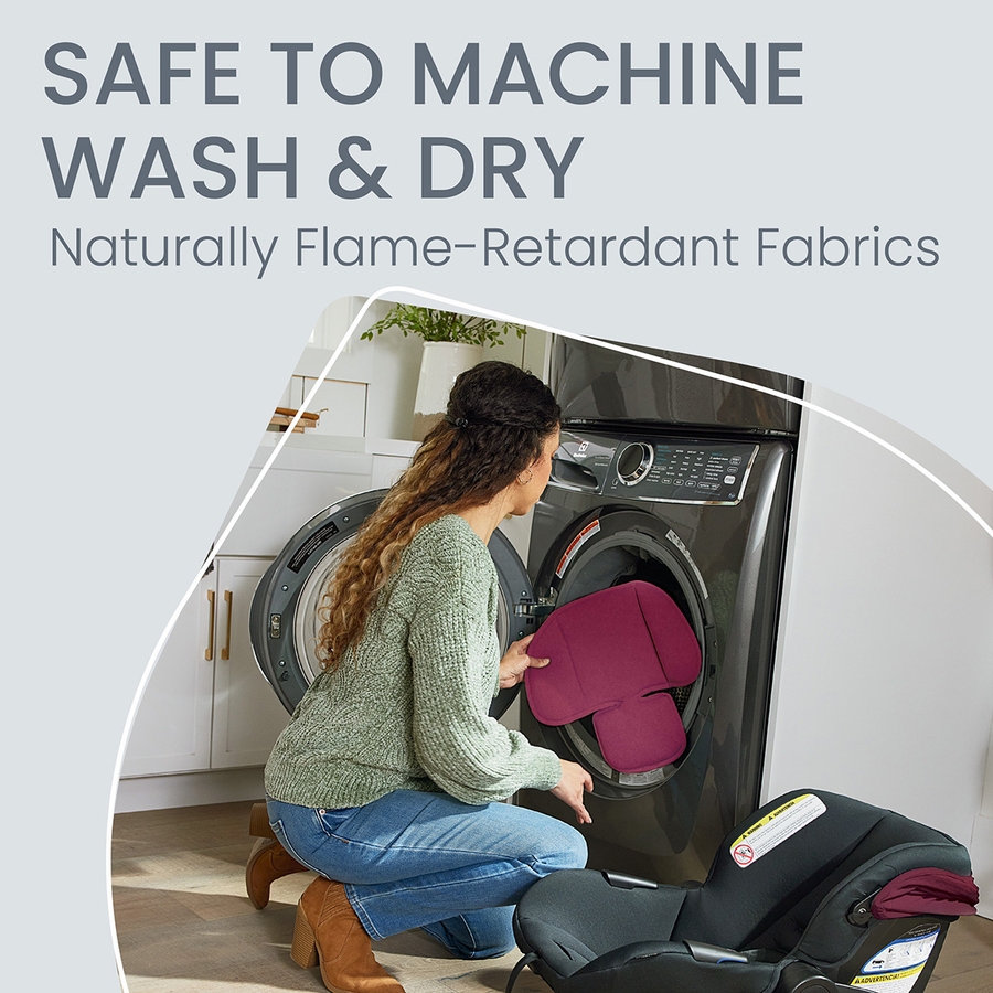 This baby car seat features naturally flame-retardant fabrics that are safe to wash and dry, along with an extra layer of cushioning helps prevent skin irritation and keep your child comfortable.