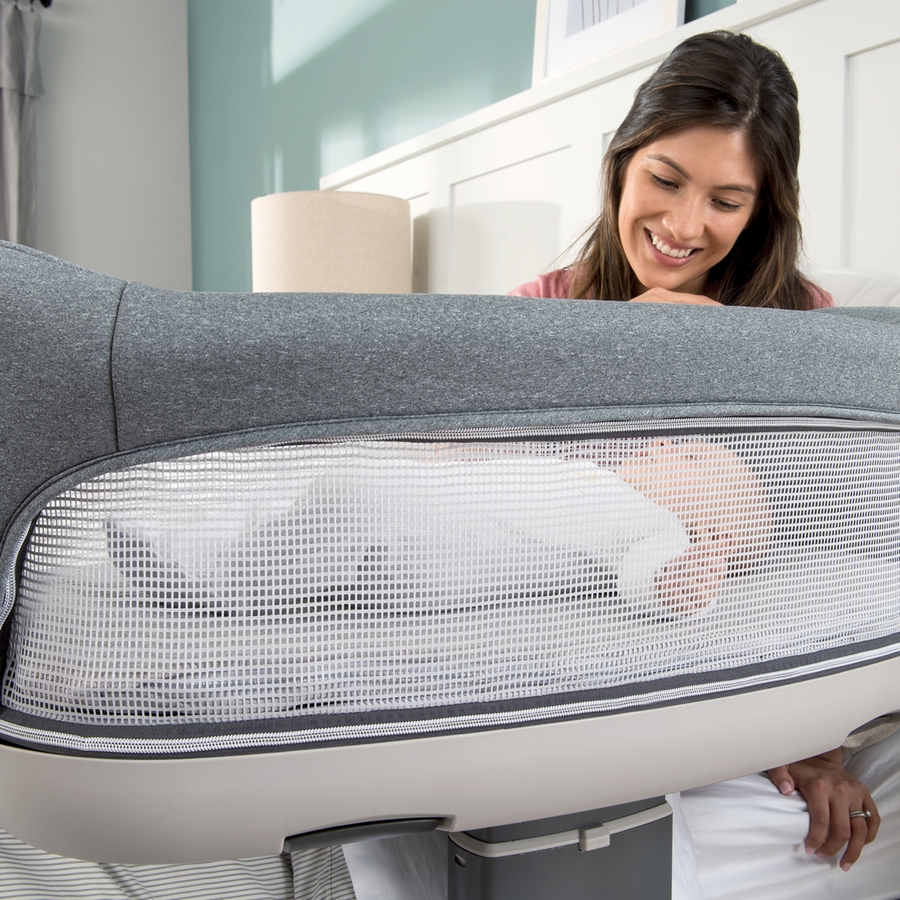 Swivel wheels, mesh side panels and a range of height adjustment allow baby to be as close to you as possible while sleeping in their own comfortable space in the bedside bassinet. A soft, quilted mattress along with soothing melodies and vibrations provide a restful, cozy environment.