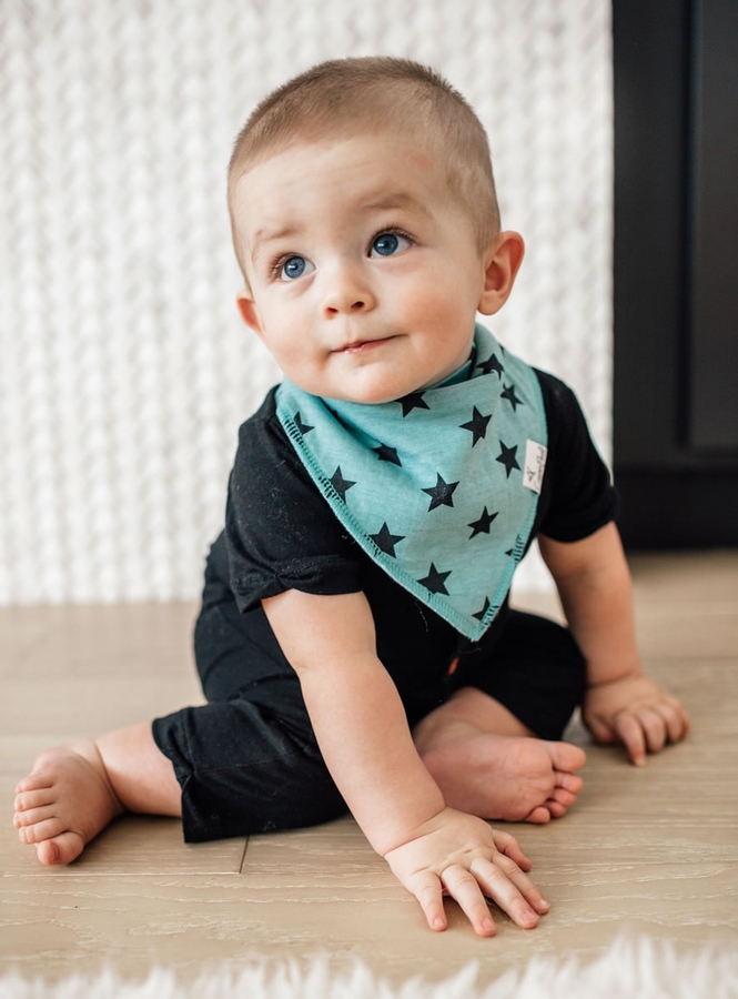 Finally, Baby bibs that are trendy, fashion forward, and functional. Your baby will have the cutest fashion accessory around, and you will keep his/her clothes clean and dry from drooling. Our bandana bibs a.k.a. bibdanas, are made of 100% cotton knit on the front and 100% soft, absorbent polyester fleece on the back. These bibs will keep your baby dry even with lots of drool and dribble. They're great for drooling and teething babies. Designs are trendy and chic so your baby's style is sure to be noticed... You'll no longer have to worry about boring and ugly bibs covering up your child's cute outfit. 2 adjustable snaps make this great for infants and toddlers (age: 3-24 months) and get rid of that annoying Velcro.