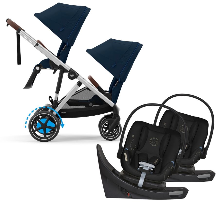 Cybex eGazelle S Double Stroller + Aton G Swivel SensorSafe Twin Travel System Bundle - Silver Frame / Ocean Blue / Moon Black