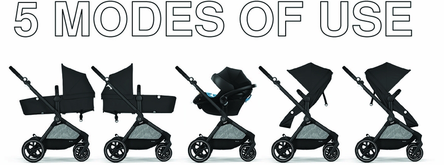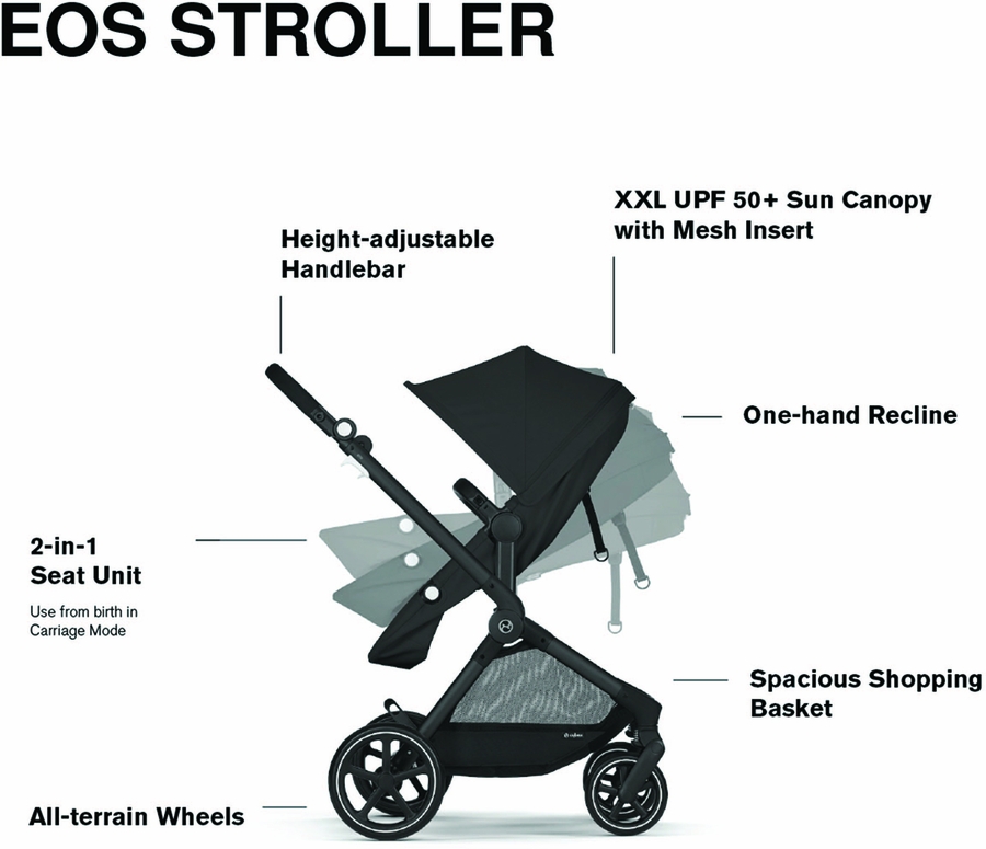 - 5 MODES OF USE: Easily adapting to your ever-changing needs, the EOS can be configured into five distinct modes: front-facing Carriage Mode, rear-facing Carriage Mode, front-facing Seat Mode, rear-facing Seat Mode, and Travel System Mode when you attach a CYBEX infant car seat.