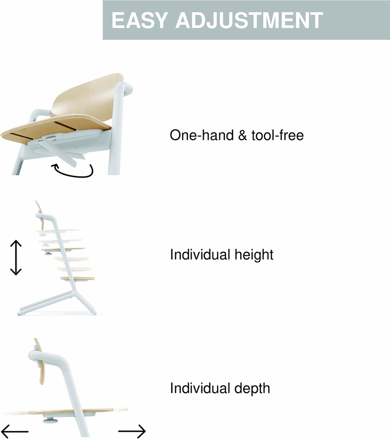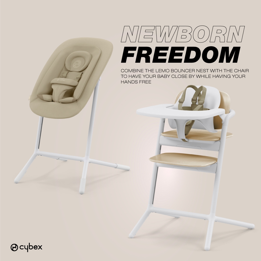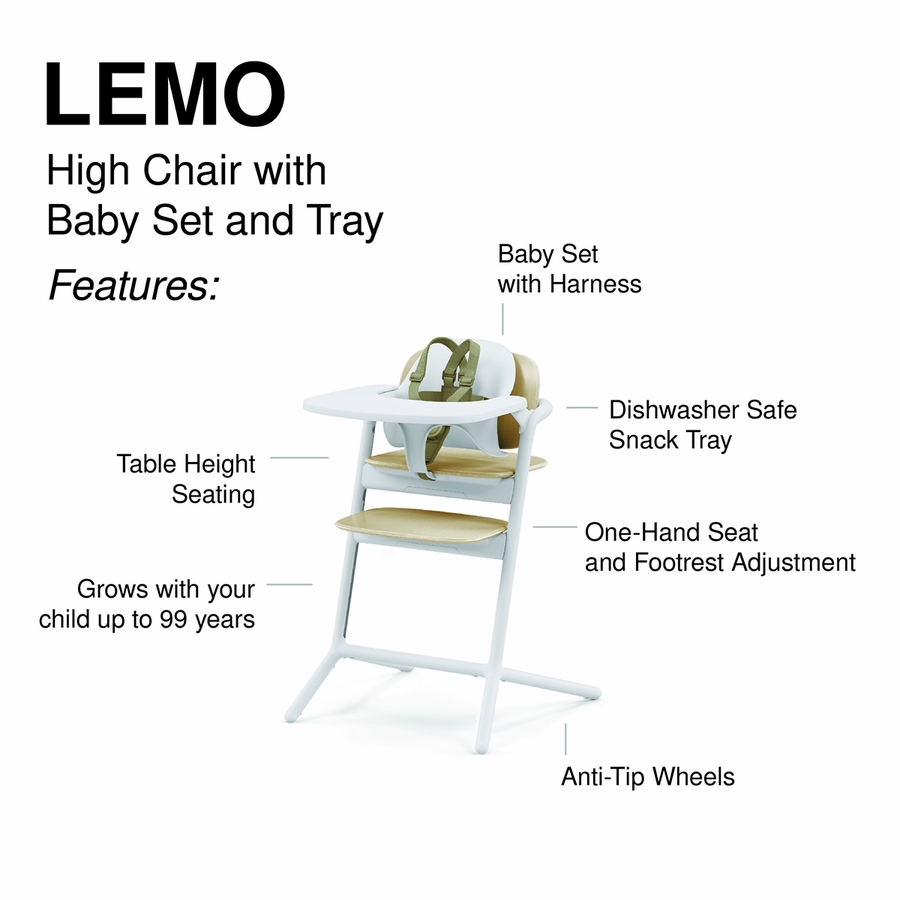 The CYBEX LEMO 4-in-1 High Chair offers multiple configurations that grow with your baby and fits seamlessly into your lifestyle. Simply use the matching accessories for your child’s age and the LEMO High Chair can be used from birth and beyond. From birth, attach the LEMO Bouncer Nest to the chair to keep your baby close at the kitchen table. At 6 months, use the Baby Set and Snack Tray to make mealtime a breeze. As your child grows, remove the accessories to transform the LEMO into an everyday chair that can be used for many years to come.