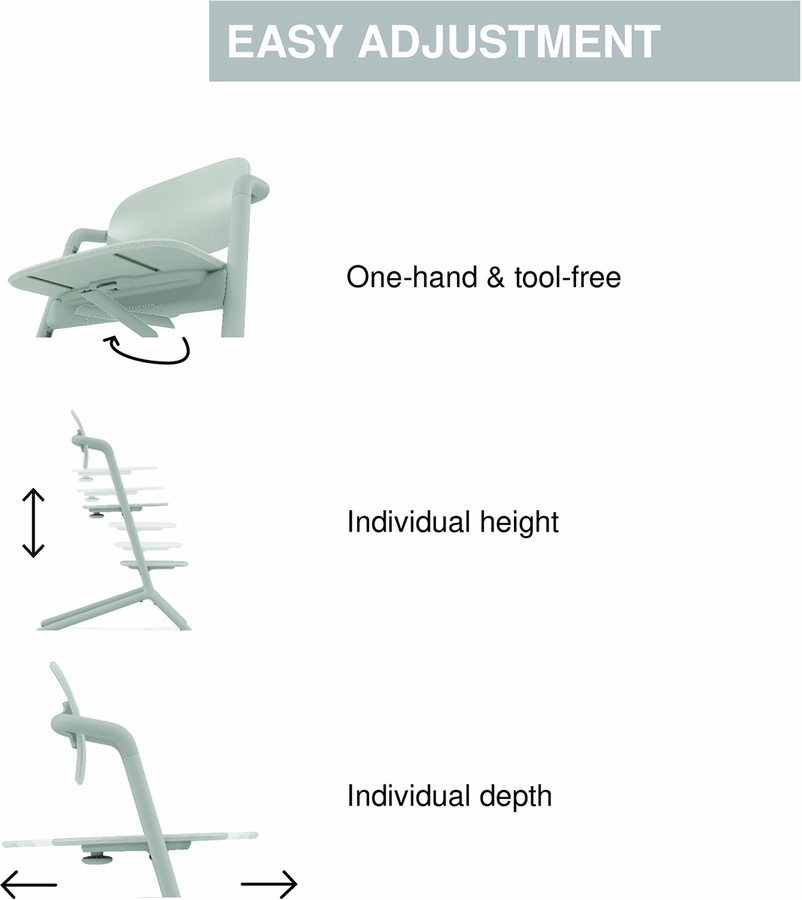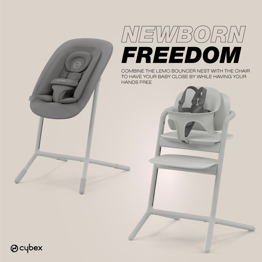 The CYBEX LEMO 4-in-1 High Chair offers multiple configurations that grow with your baby and fits seamlessly into your lifestyle. Simply use the matching accessories for your child’s age and the LEMO High Chair can be used from birth and beyond. From birth, attach the LEMO Bouncer Nest to the chair to keep your baby close at the kitchen table. At 6 months, use the Baby Set and Snack Tray to make mealtime a breeze. As your child grows, remove the accessories to transform the LEMO into an everyday chair that can be used for many years to come.