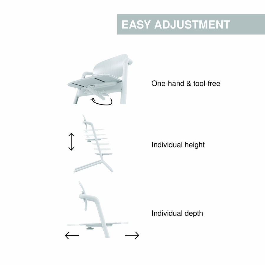 The CYBEX LEMO 2 high chair is a timeless piece that can be used from 3 to 99 years. As your child grows, easily adjust the seat height and depth for a comfortable fit and enjoy for many years to come.