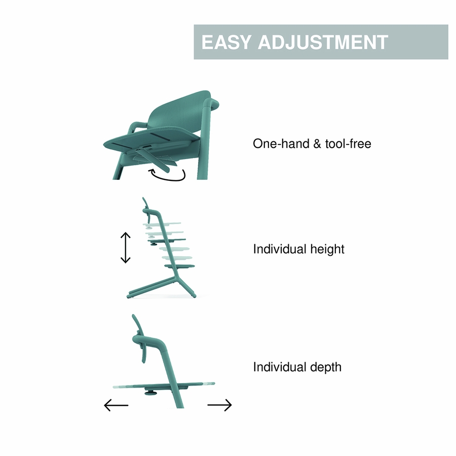 The CYBEX LEMO 2 high chair is a timeless piece that can be used from 3 to 99 years. As your child grows, easily adjust the seat height and depth for a comfortable fit and enjoy for many years to come.