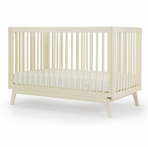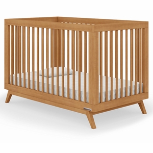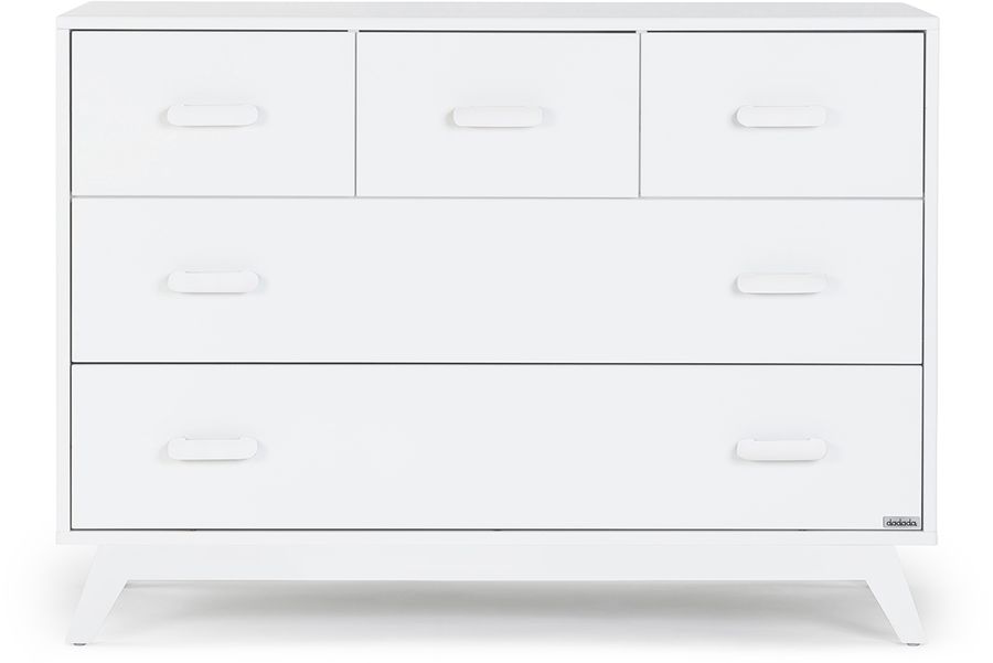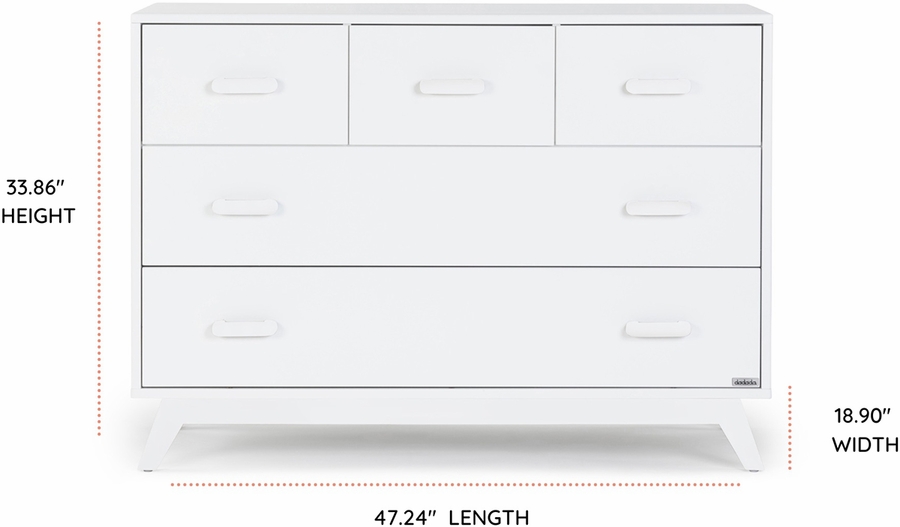Newly updated to meet the latest safety standards, the version of the 48” modern Soho 5-drawer dresser’s classic style pairs perfectly with the Soho 3-in-1 crib, or adds a pop of mid-century style to any room on its own. Safe, stable, and strong, with sturdy angled legs and solid wood handles, and a baby-safe painted finish.