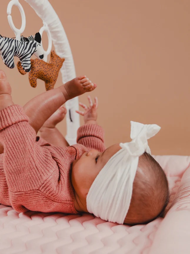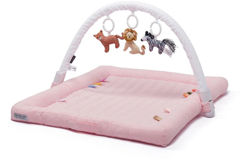 The beautifully quilted base with slightly raised edges provides an ideal environment for baby to practice their first reaches, rolls and head-lifts while the detachable Toy Arch ignites their senses through colour and texture during the early stages of sensory development.