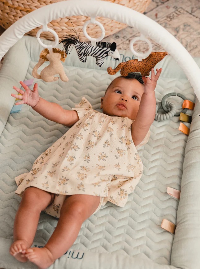The beautifully quilted base with slightly raised edges provides an ideal environment for baby to practice their first reaches, rolls and head-lifts while the detachable Toy Arch ignites their senses through colour and texture during the early stages of sensory development.