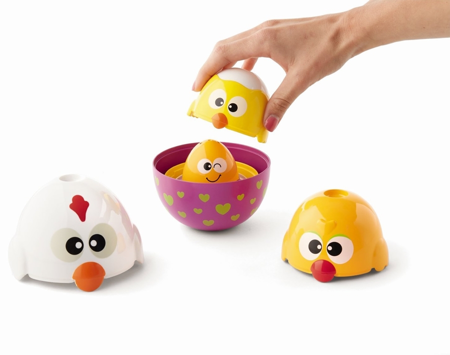 This fun, colorful set takes stacking, nesting, and fine motor skills to a new level, because before kids start stacking, they need to match two halves to make the chicks to stack. Then the real fun, crash the matched stack and start all over again with a scrambled set of 8 halves, and maybe, for a different challenge, nest them this time. For ages 6 mos. and up.