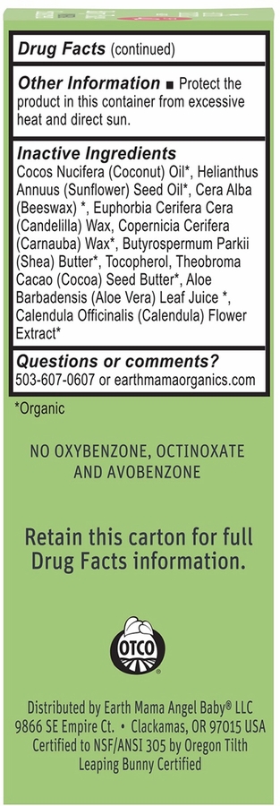 Ingredients: Active Ingredient: Zinc Oxide 22%, Inactive Ingredients: Cocos Nucifera (Coconut) Oil*, Helianthus Annuus (Sunflower) Seed Oil*, Cera Alba (Beeswax) *, Euphorbia Cerifera Cera (Candelilla) Wax, Copernicia Cerifera (Carnauba) Wax*, Butyrospermum Parkii (Shea) Butter*, Tocopherol, Theobroma Cacao (Cocoa) Seed Butter*, Aloe Barbadensis (Aloe Vera) Leaf Juice *, Calendula Officinalis (Calendula) Flower Extract* *Organic