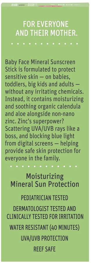 Baby Face Mineral Sunscreen Face Stick is free of toxic chemicals, this cruelty-free face stick glides on smoothly and is infused with organic calendula and soothing organic aloe to keep that sweet baby skin soft and moisturized. P.S. You don’t have to be a baby to benefit — use this to keep your cheeks baby soft!