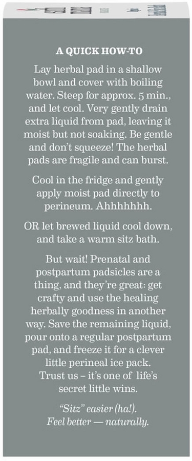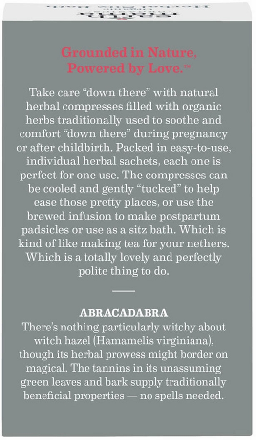 Take care ?down there? with herbal compresses filled with organic herbs traditionally used to soothe and comfort ?down there? during pregnancy or after childbirth. Packed in easy-to-use, individual herbal sachets, each one is perfect for one use. The compresses can be cooled and gently ?tucked? to help ease those pretty places, or use the brewed infusion to make postpartum padsicles or use as a sitz bath. Which is kind of like making tea for your nethers. Which is a totally lovely and perfectly polite thing to do.