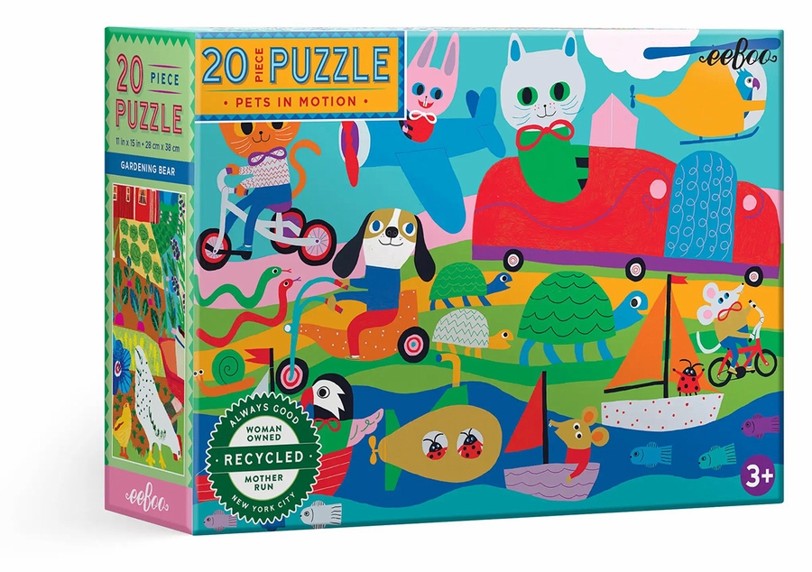 Take to the sky, cross oceans wide, or pedal alongside 3-wheeled friends in this charming Pets in Motion 20 piece puzzle. This bright and cheerful scene is sure to bring a smile to young faces as they piece it together, with plenty of tales to be imagined on completion. Where is each animal going? Beautifully illustrated by Monika Forsberg and finished to the highest quality with a glossy touch, this puzzle will not only provide challenge and intrigue - it feels lovely to play with too.