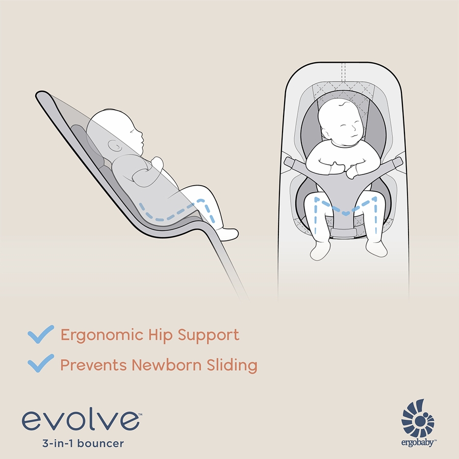 Babies grow, but most baby bouncer chairs don’t—this bouncer does. From a cozy newborn lounger to a calming baby bouncer to a fun and functional toddler seat, the 3-in-1 Evolve Bouncer safely supports your child at every stage of growth. Starting from day one, Ergobaby’s infant to toddler rocker has your child safely and comfortably covered. Thanks to our newborn insert, you can use this baby bouncer seat starting from 5 lbs 8 oz up to 29 lbs.