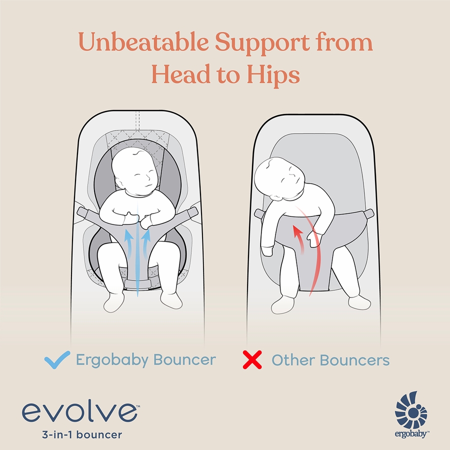 Babies grow, but most baby bouncer chairs don’t—this bouncer does. From a cozy newborn lounger to a calming baby bouncer to a fun and functional toddler seat, the 3-in-1 Evolve Bouncer safely supports your child at every stage of growth. Starting from day one, Ergobaby’s infant to toddler rocker has your child safely and comfortably covered. Thanks to our newborn insert, you can use this baby bouncer seat starting from 5 lbs 8 oz up to 29 lbs.